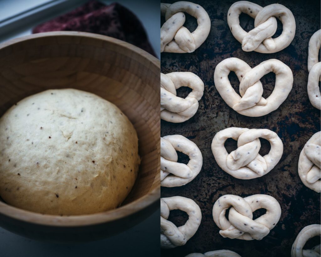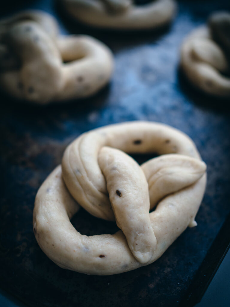 Divide the dough into 12 equal pieces. On a clean surface, roll out each pieces of dough into a long and thin rope, about 18 inches (45 cm) long. Form each dough rope into a U-shape, then twist the ends together. Bring the twisted ends back down over the bottom of the U-shape and press down to form a pretzel shape. Place on the prepared baking sheet, cover with a tea towel, and let rise for 30 minutes.