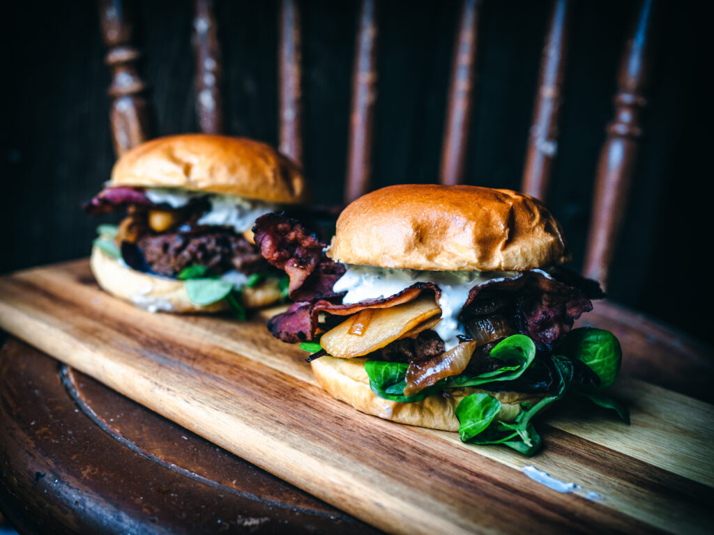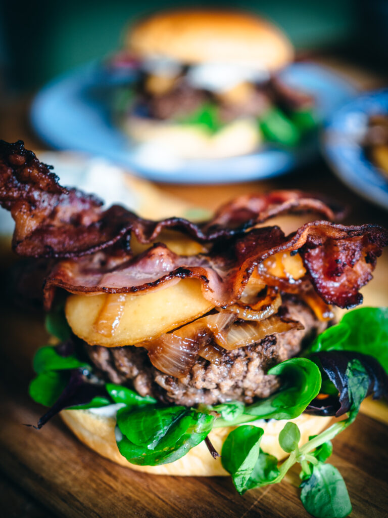 Enjoying these in the garden surrounded by apple trees is a wonderful way of appreciating the season and the bounty that it provides. You can also swap out the blue cheese sauce and just melt a flavorful cheese, such as brie, over the patties as they finish cooking. You can also omit the bacon altogether and still have a decadent burger.