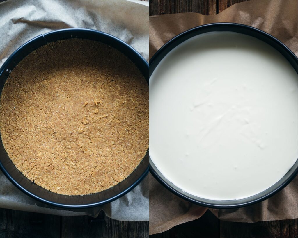In a large bowl, stir together the crushed biscuits and melted butter. Press the biscuit mixture on the bottom of the prepared pan and refrigerate until ready to use.