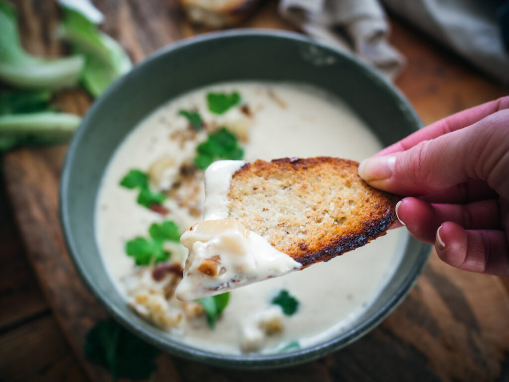 To serve, ladle the soup into individual bowls and top with the reserved cauliflower and shallots, if using, and garnish with herbs and a dash of cream. Serve with crusty bread to dip.